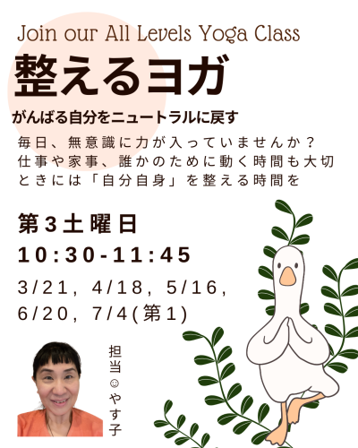 ヨガが終わる頃には、身体が軽くなり、心に余白が生まれる感覚を味わえるはずです。 明日をまた心地よく始めるために、心身を「リセット」しに来ませんか?